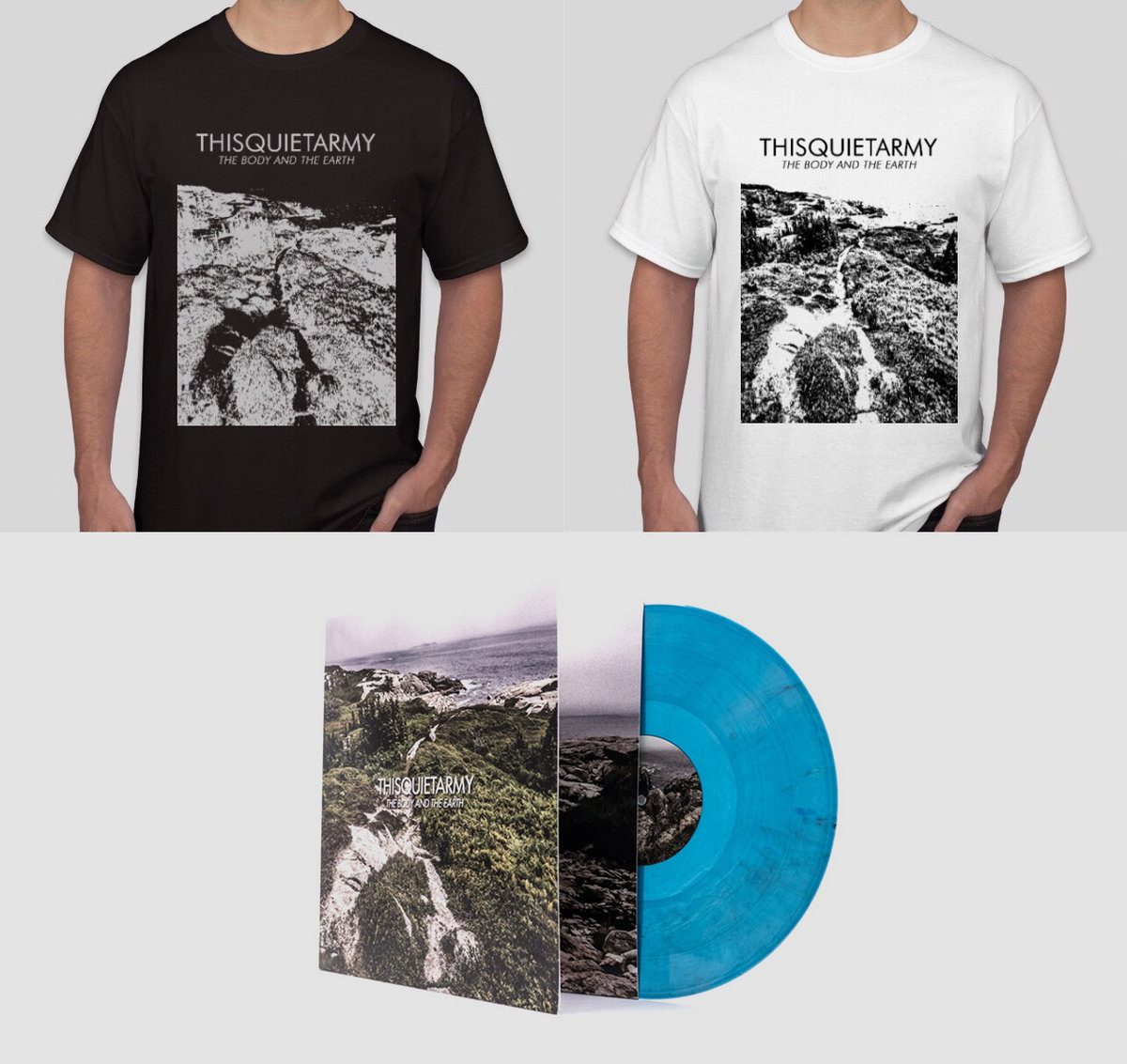 Save on shipping with this color gatefold vinyl and t-shirt combo (choice of silver ink on black - heavy cotton or black ink on white t-shirt - soft style, limited quantities while they last).